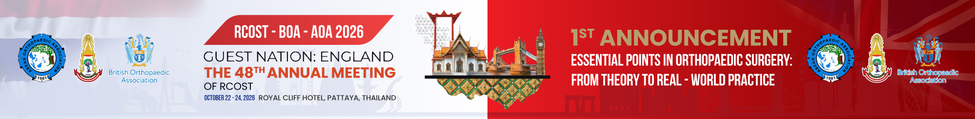 It is an honour to welcome you to the 48th Annual Meeting of RCOST, along with BOA and 46th Annual Meeting of Asean Orthopaedic Association (AOA), in 2026. This year, we are collaborating to explore the theme: “Essential Points in Orthopaedic Surgery: From Theory to Real-World Practice”. The transfer of knowledge and experience will advance orthopaedic care across the Pacific.