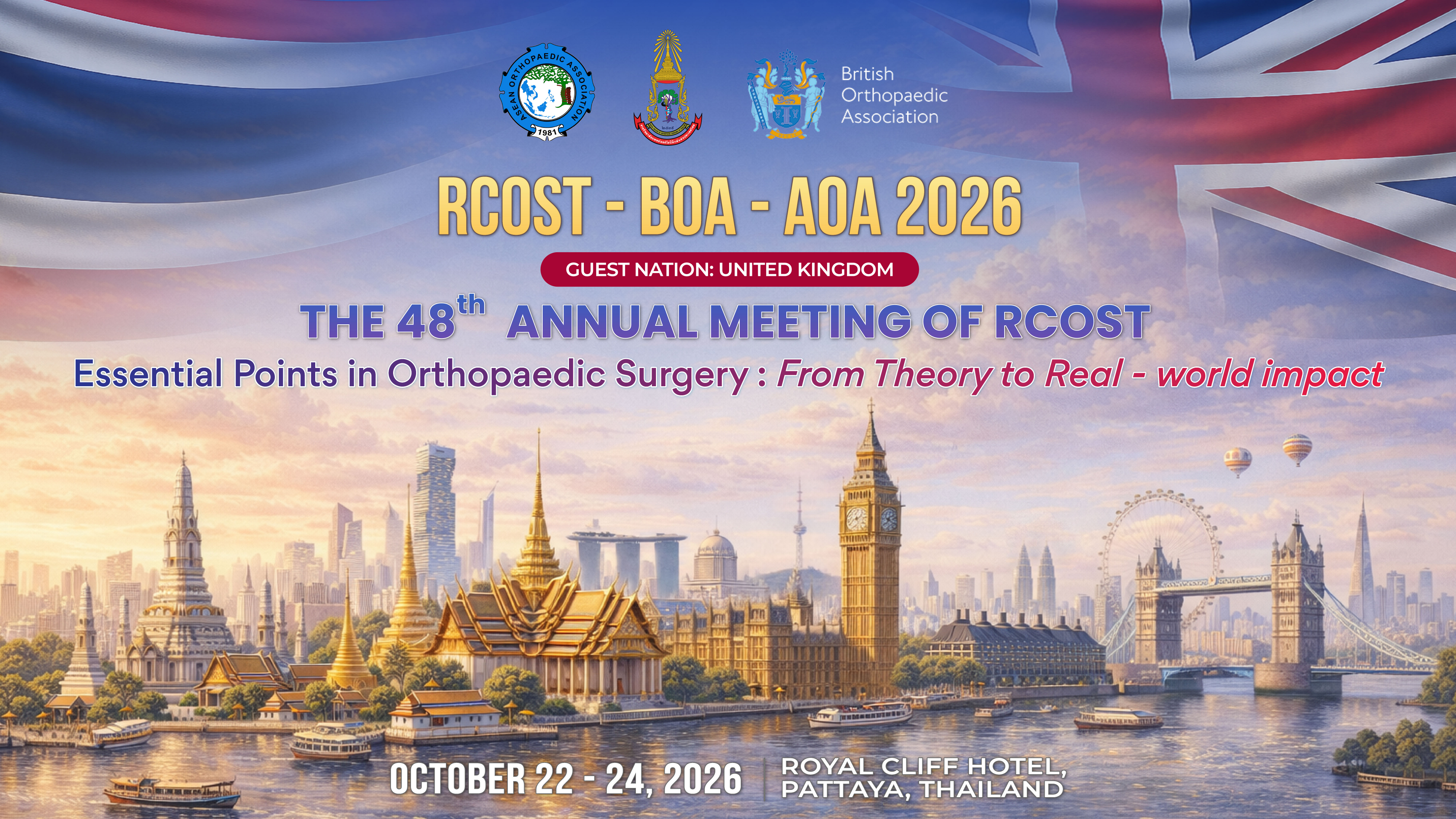 On behalf of the Royal College of Orthopaedic Surgeons of Thailand, I am truly honored and delighted to welcome all of you to the 48th Annual Meeting of RCOST, which will be held right here in the beautiful city of Pattaya, from October 22nd to 24th, 2026, at PEACH, the Royal Cliff Hotel.